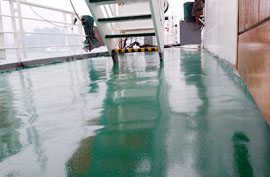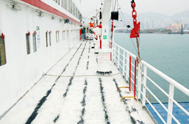 接到該訂單后,公司派一支素質(zhì)過硬的施工隊伍奔赴香港開始作業(yè),由于期間香港天氣變化反復(fù),時常下雨;待基面底漆頑固,銹跡斑斑難以清理,均為凹凸不平的麻面;再加上該郵輪白天需正常營業(yè),施工多只能在晚上進行,等等一系列因素都給施工帶來了嚴峻考驗。青龍公司歷來重視每一筆訂,注重每一個細節(jié),董事長宋敦清先生得知后,親自前往,與公司總工徐新生論證了一個最佳方案后開始指導(dǎo)施工,考慮到施工部位特殊,長期在海面上風(fēng)吹日曬,最后選用了其耐候、耐酸堿、耐紫外線、耐老化、耐霉菌、耐鹽霧、耐臭氧、耐溶劑、耐磨、耐沖擊和耐油性等綜合性能優(yōu)異的CQ101防水密封涂料。先用特殊纖維填充10mm高度,再在上面找平3mm厚,然后用青龍CQ101防水密封涂料自流平成膜。經(jīng)過一個星期的艱苦奮戰(zhàn),順利完成施工。