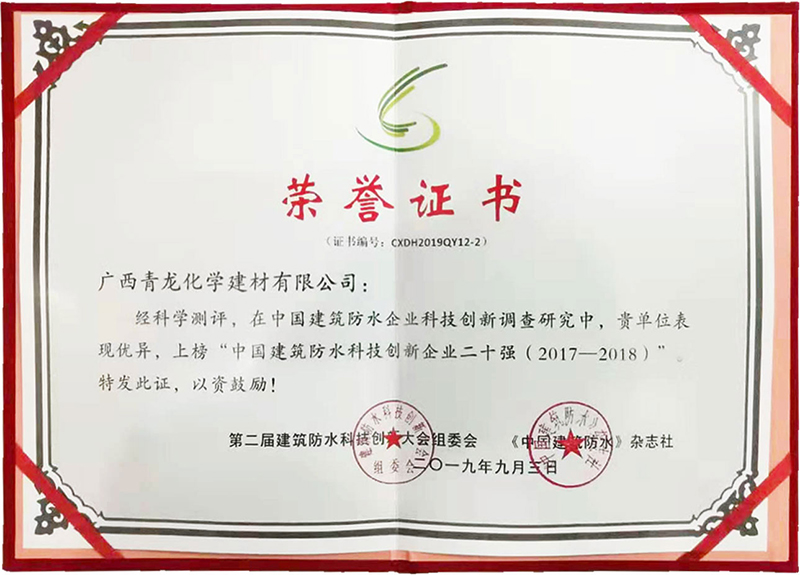 9月,第二屆建筑防水科技創(chuàng)新大會(huì)上,青龍司榮獲"中國(guó)建筑防水科技創(chuàng)新企業(yè)二十強(qiáng)",成為繼獲得首屆建筑防水科技創(chuàng)新大會(huì)"科技先鋒企業(yè)"和"科技先鋒人物"之后,青龍?jiān)佾@"科技"類(lèi)殊榮,彰顯了青龍公司強(qiáng)勁的科技創(chuàng)新實(shí)力和在行業(yè)的技術(shù)地位。