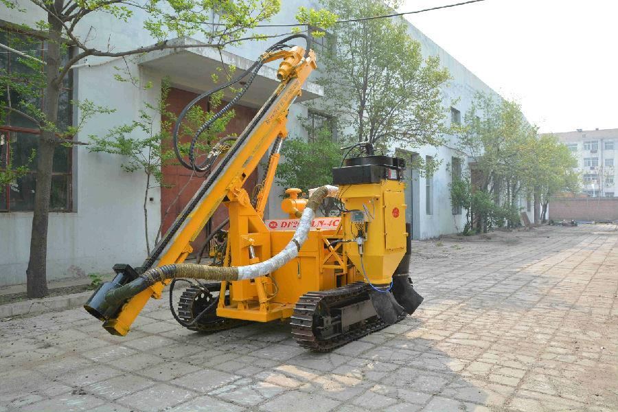 該系列履帶式潛孔鉆機主要用于露天礦山及石方工程鉆鑿下向傾斜爆破孔作業(yè)。該鉆機采用內(nèi)燃機(或電動機)油泵組為動力,液壓馬達行走、回轉(zhuǎn),液壓馬達鏈條推進及提升,油缸擺角定位,傳動結(jié)構(gòu)簡單,易損件少,耗氣量低。